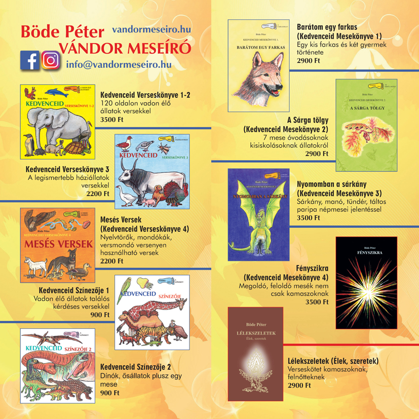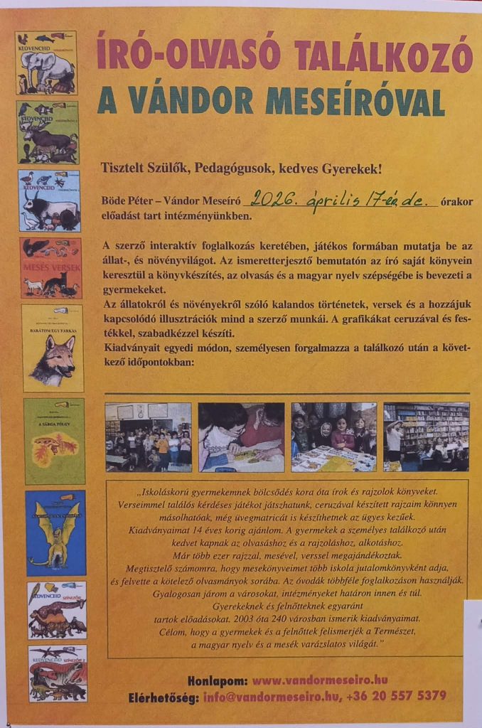 Örömmel értesítünk mindenkit, hogy meghívásunkra április 17-én vendégül láthatjuk Böde Pétert, a Vándor Meseírót! Író-olvasó találkozói során, a résztvevők játékos, humoros formában tanulhatnak az állat-, és növényvilágról. Az író fontos küldetésének tartja, hogy bevezesse a fiatalokat a magyar nyelv szépségébe, sokszínűségébe. Gondolatain keresztül ösztönzi a diákokat olvasásra, alkotásra és önbizalmukat erősítve lelkesíti céljaik elérésében. A találkozót követően délután dedikálással egybekötve az iskola főbejáratánál vásárolhatják meg az író, költő alkotásait. Dedikálásra és vásárlásra további lehetőség nyílik az iskolában április 22-én délután 13.00-17.00 között.
